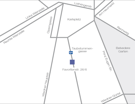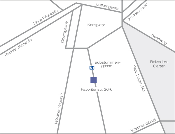 Die Kanzlei befindet sich im 4. Bezirk, Ecke Favoritenstraße/Mayerhofgasse. Wenn Sie mit dem Auto kommen, ist zu beachten, dass der 4. Bezirk Kurzparkzone ist.